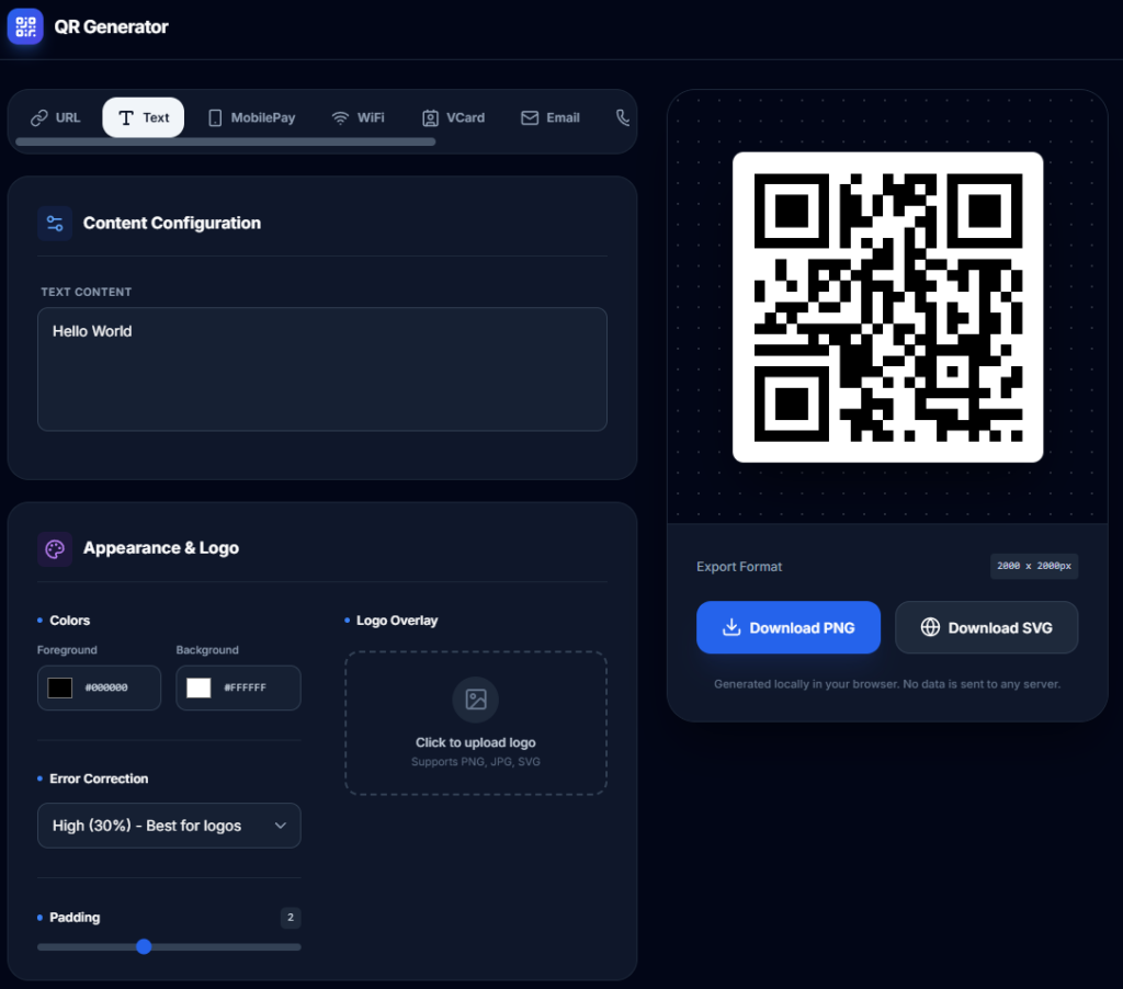 - Mulighed for at downloade koden som PNG-billede eller SVG-vektor.