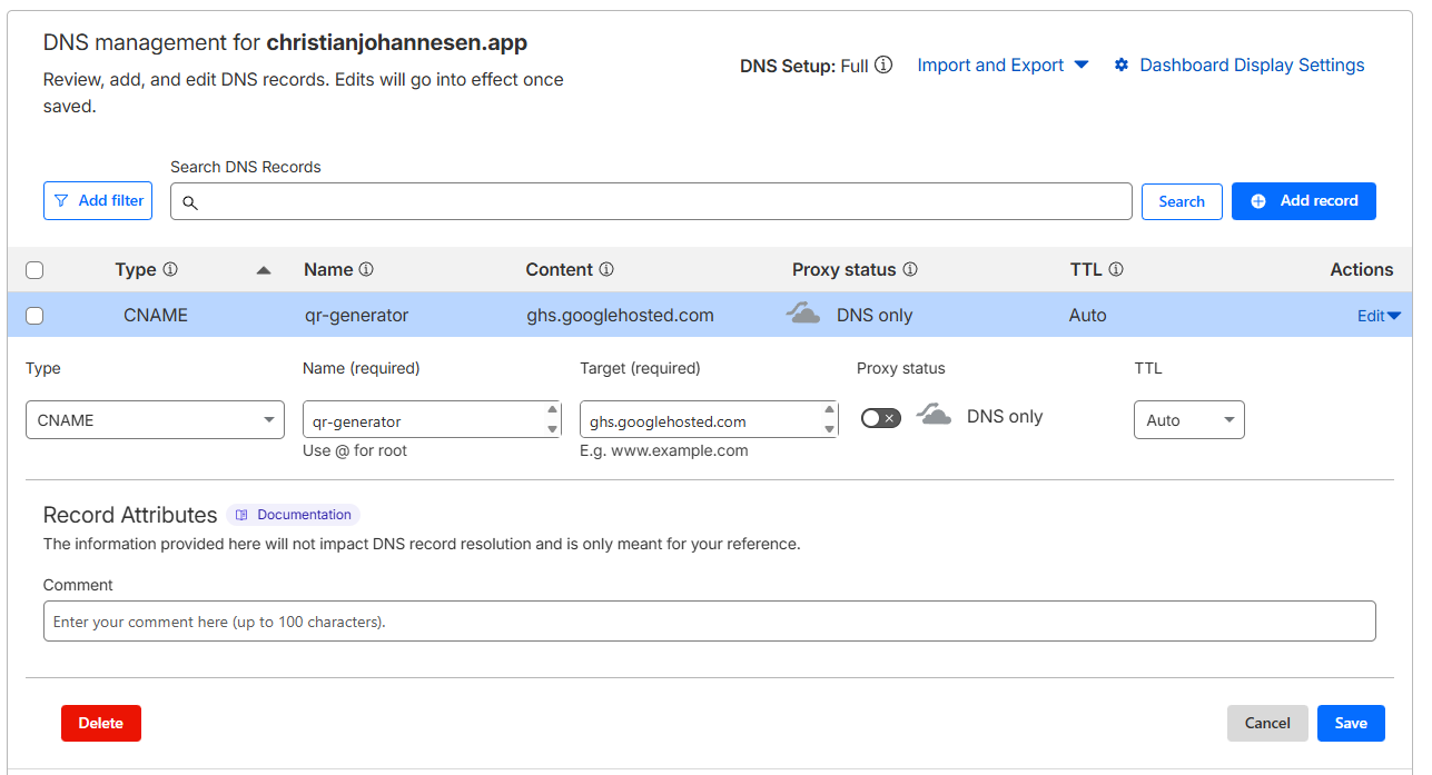 Efter domain mapping’en er sat op hos Google, skal subdomænet oprettes som CNAME (i mit tilfælde) hos Cloudflare og peges mod Google-land.